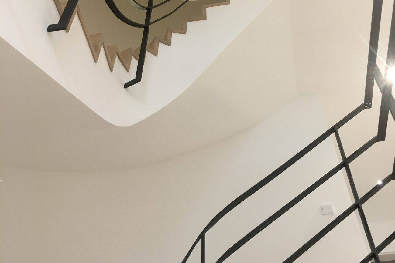Angefangen vom Eingangsbereich mit Lofttür als trennendes Element, bis hin zum geschwungenen Treppen- und Brüstungsgeländer. Die angefertigten Objekte fügen sich durch ihren minimalistischen Stil ideal ein ohne aufdringlich zu wirken.
