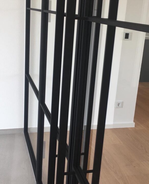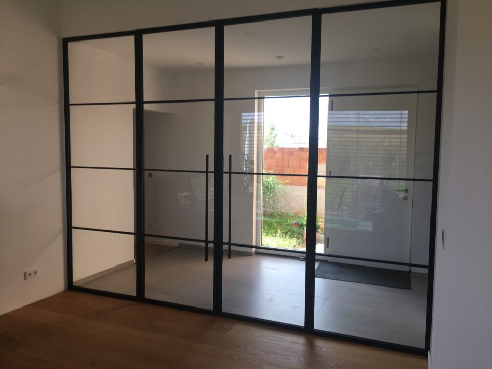 Auf Wunsch des Kunden sollte der Eingansbereich des Einfamilienhauses (Bungalow-Bauweise) vom restlichen Wohnbereich abgetrennt werden, ohne dabei die Weitläufigkeit der Rämlichkeiten zu verlieren. Durch die Verwendung einer Lofttür mit feststehenden Seitenelementen im Eingangsbereich, lies sich so eine architektonische Trennung des Eingangsbereichs vom Wohnbereich erreichen.